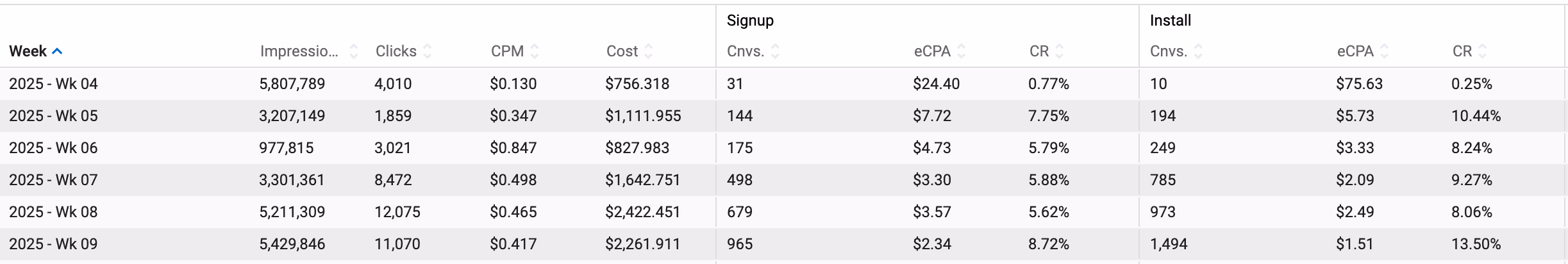 However, 194 installs weekly was far from the scale our client needed. Our next challenge was clear: increase volume while maintaining or improving cost efficiency in a traffic-constrained vertical.
